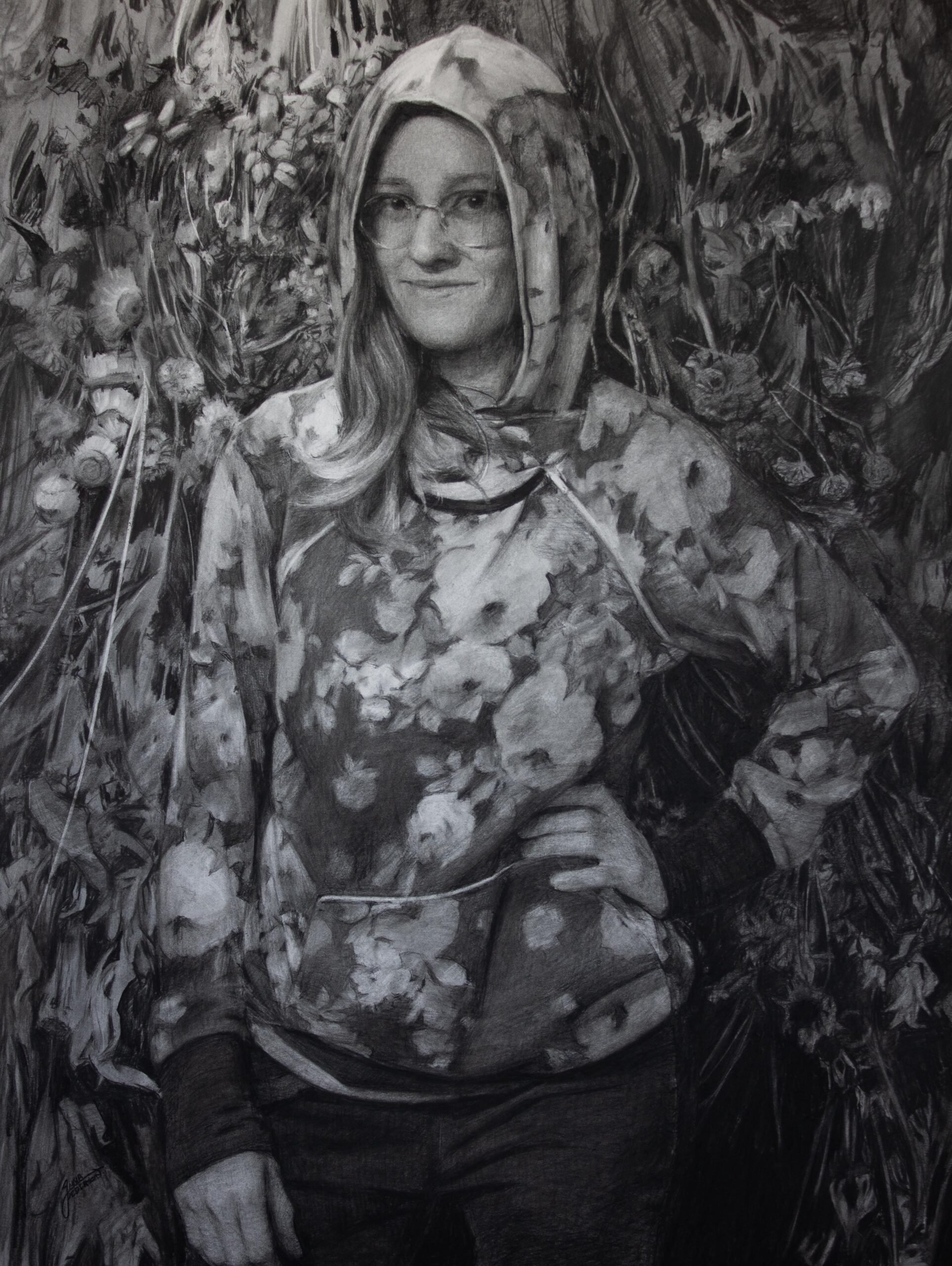 Below are some examples of Anna's exemplary charcoal drawings including her self portrait in front of our gallery flower wall.